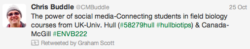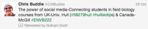 Students have already started to connect with scientists from other institutions - they are already feeling part of something bigger. For example, students in a field biology course at the University of Hull in the UK have connected with McGill students - the students from the two institutions can share connect, collaborate and share their experiences. This can be done easily through #hashtags: