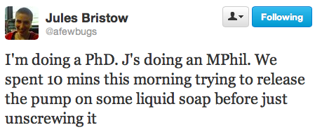 - Speaking of twitter, it brings me many, many smiles. Here’s the funny tweet of the week, from Jules Bristow (remind you of this?)
